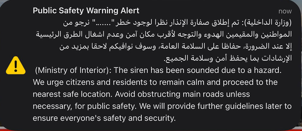 يأتي ذلك بينما أفادت الداخلية البحرينية بإطلاق صفارات الإنذار، ودعت المواطنين والمقيمين التوجه لأقرب مكان آمن.
