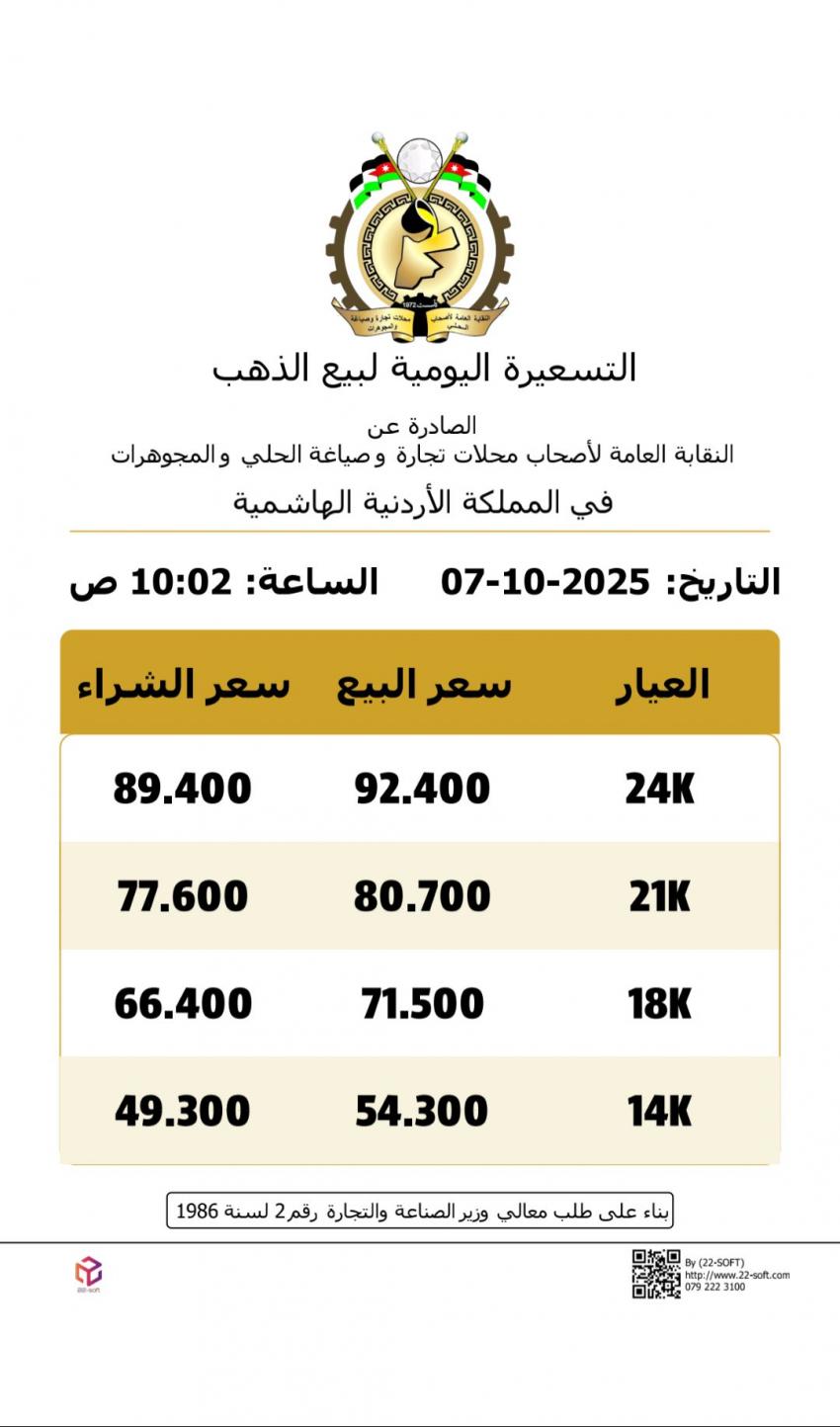 ووفقًا للنشرة اليومية الصادرة عن النقابة العامة لأصحاب محلات تجارة وصياغة الحلي والمجوهرات، ارتفع سعر الغرام الواحد من الذهب لعيارات 24 و18 و14 إلى 92.4 دينارًا و71.5 دينارا و54.3 دينارًا على التوالي، لغايات البيع من محلات الصياغة.
