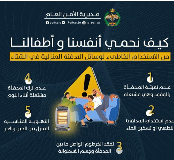واكدت المديرية على أهمية الاستخدام الصحيح والآمن لوسائل التدفئة، بما يضمن الحفاظ على سلامتكم وسلامة أحبائكم وتجنب الحوادث.