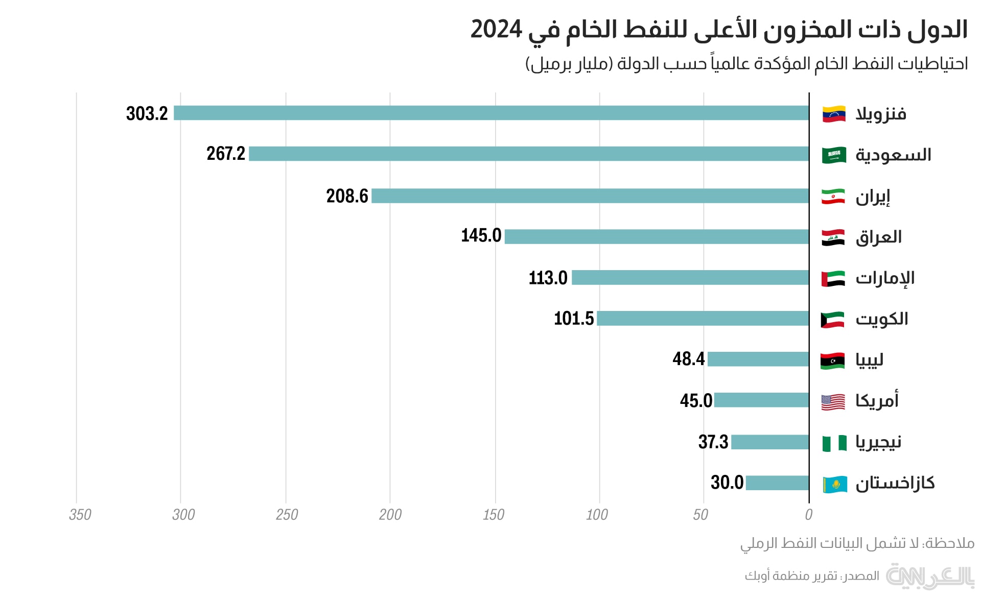 وبحسب التقرير، تصدّرت فنزويلا قائمة الدول من حيث أكبر احتياطي للنفط الخام في عام 2024. فعلى الرغم من شيوع ربط الاحتياطيات النفطية الضخمة بمنطقة الشرق الأوسط أو بولاية تكساس الأمريكية، تمتلك فنزويلا مخزونًا هائلًا يُقدَّر بنحو 303 مليارات برميل من النفط الخام في عام 2024، أي ما يعادل قرابة خُمس الاحتياطيات العالمية، وذلك وفقًا لبيانات إدارة معلومات الطاقة الأمريكية، ويُعدّ هذا الاحتياطي الأكبر المعروف عالميًا.