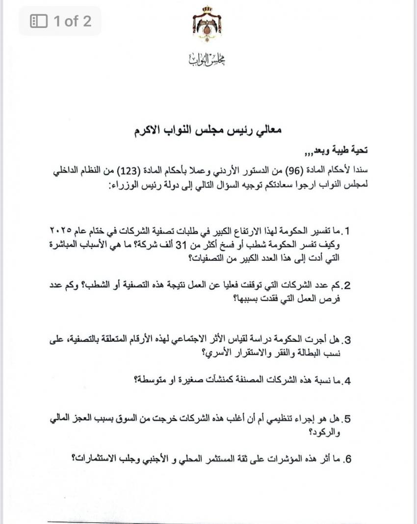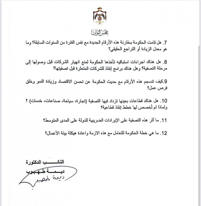 كرمالكم : وجّهت النائب الدكتورة ديمة طهبوب سؤالاً نيابياً إلى الحكومة، عبر رئاسة مجلس النواب، حول الارتفاع الكبير في طلبات تصفية وشطب الشركات في الأردن خلال عام 2025، والتي تجاوز عددها 31 ألف شركة.