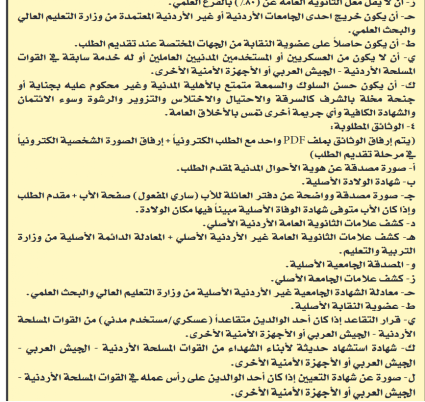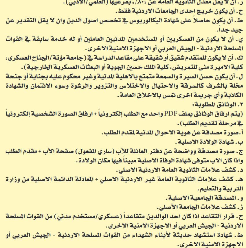 كذلك أعلنت القيادة العامة للقوات المسلحة الأردنية – الجيش العربي، اليوم الخميس، عن البدء باستقبال طلبات الالتحاق بدورة الممرضين القانونيين في كلية الاميرة منى الحسين.