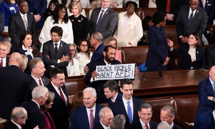 رفع نائب ديموقراطي من أصل إفريقي لافتة كتب عليها "السود ليسوا قرودا” خلال إلقاء الرئيس الأمريكي دونالد ترامب خطاب حالة الاتحاد أمام الكونغرس مساء الثلاثاء، قبل أن يتم اقتياده خارج القاعة.