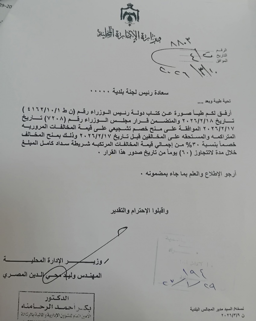 كرمالكم :    ينال المعاني - أوعز وزير الإدارة المحلية المهندس وليد المصري، بتنفيذ قرار مجلس الوزراء بمنح خصم تشجيعي على قيمة المخالفات المرورية المتراكمة والمستحقة على المخالفين قبل تاريخ 17/2/2026 بمقدار 30% من إجمالي قيمة المخالفات المرتكبة.