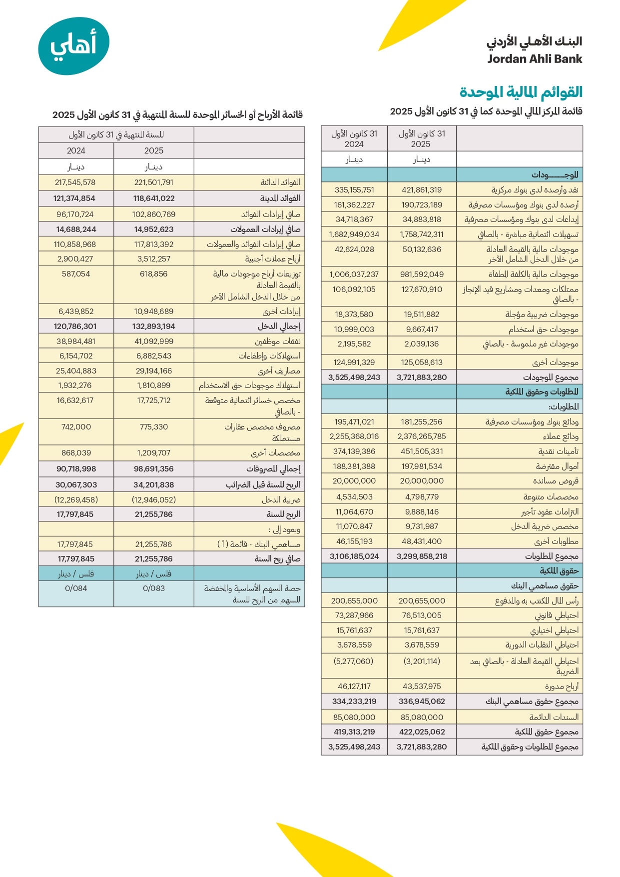 وأوضح المعشر أن البنك حقق تطوراً ملحوظاً في أدائه المالي خلال عام 2025، حيث ارتفعت موجودات البنك لتصل إلى نحو 3.7 مليار دينار بنمو نسبته 5.6% مقارنة بالعام السابق. مشيرًا إلى أن هذا النمو يعزى بشكل رئيسي إلى تحسن مصادر التمويل، وفي مقدمتها ودائع العملاء التي ارتفعت بنسبة 5.4% لتصل إلى 2.4 مليار دينار، مما عزز قدرة البنك على التوسع في التسهيلات الائتمانية لتصل إلى 1.8 مليار دينار بالصافي. كما لفت المعشر إلى انعكاس هذه النتائج على الربحية، حيث سجلت مجموعة البنك أرباحاً صافية قبل الضريبة بلغت 34.2 مليون دينار، وصافي أرباح بعد الضريبة بقيمة 21.3 مليون دينار، بنسبة نمو بلغت 19.4% عن عام 2024. وفيما يتعلق بكفاية رأس المال فبلغت 17.07%، وهي أعلى من الحد الأدنى المطلوب رقابياً، في حين سجلت نسبة التسهيلات غير العاملة بالصافي 5.02%، وهي نسبة تتفوق على متوسط القطاع المصرفي البالغ 5.8%.