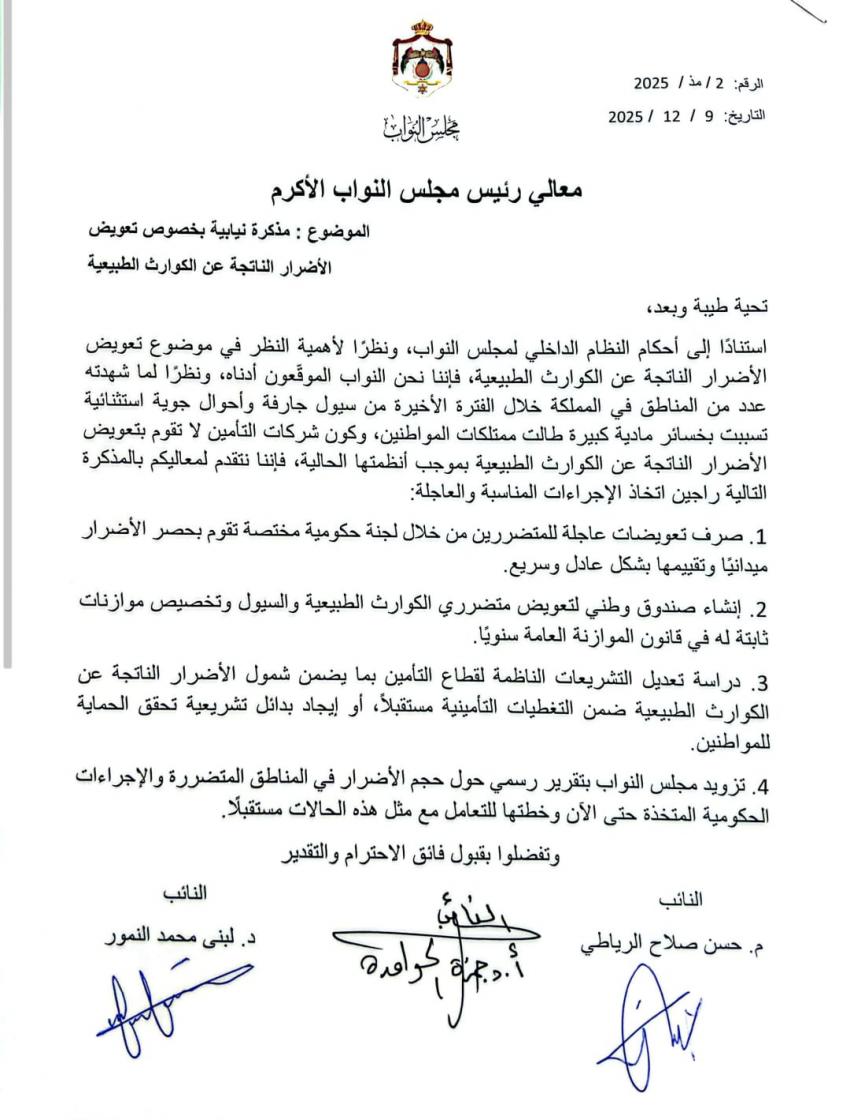 قدّم النائبان المهندس حسن صلاح الرياطي والدكتور لبنى محمد النمور مذكرة نيابية إلى رئيس مجلس النواب، طالبا فيها الحكومة باتخاذ إجراءات عاجلة لتعويض المواطنين المتضررين من الكوارث الطبيعية التي شهدتها عدة مناطق في المملكة خلال الفترة الماضية، وتسببت بخسائر مادية كبيرة نتيجة السيول والأحوال الجوية الاستثنائية.