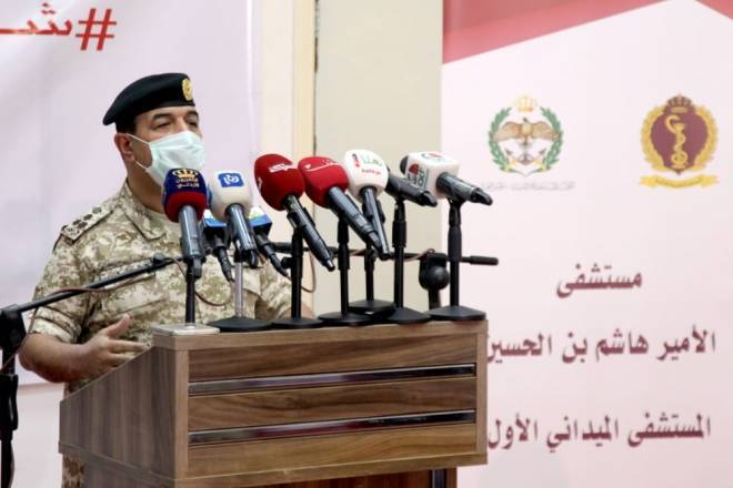 وقال مدير التوجيه المعنوي العميد الركن طلال الغبين خلال مؤتمر صحفي: " إن المستشفى جاء بتوجيهات مباشرة من جلالة الملك عبدالله الثاني، القائد الأعلى للقوات المسلحة، لتعزيز جهود القوات المسلحة الأردنية للتعامل مع الجائحة وتخصيصه بالكامل لاستقبال الحالات المثبت اصابتها بفيروس كورونا، إذ يتسع المستشفى إلى نحو (300) سرير لمرضى كورونا منها (48) سرير (ICU)، و(12) سرير عناية متوسطة مزود بكافة التجهيزات الطبية والعلاجات والإدارية، إضافة إلى الكوادر الطبية اللازمة والمؤهلة للتعامل مع الحالات المرضية المختلفة".