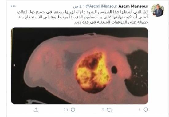 وأوضح منصور في منشور عبر صفحته على فيسبوك بأن ما يظهر في هذه الصورة هو نتيجة استهلاك هذا الالتهاب لمادة الجلوكوز وهو ما نشاهده عادة في حالات السرطان والالتهابات المختلفة.
