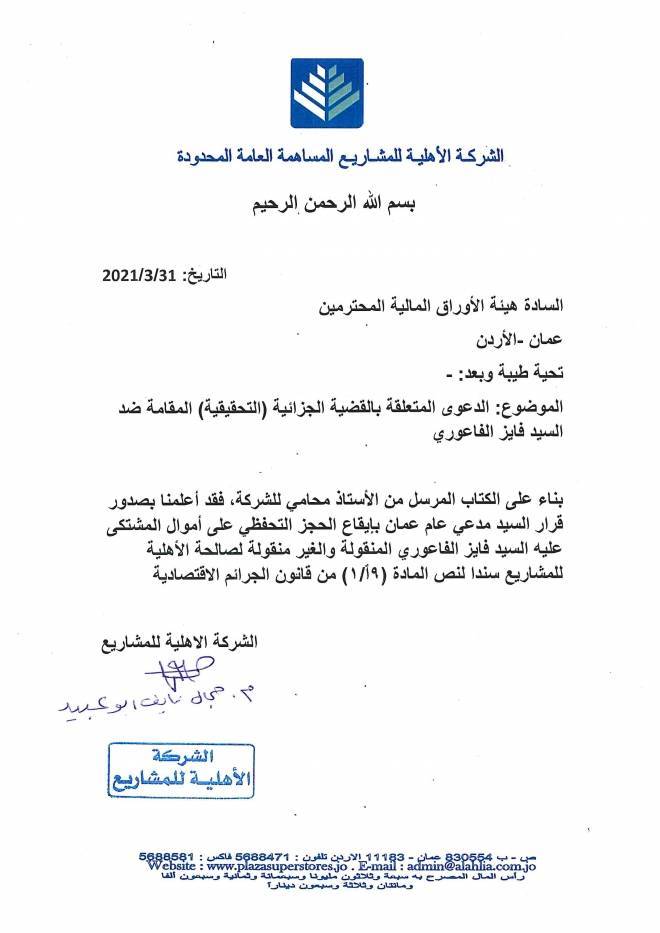 خاص- اصدر مدعي عام عمان قرارا بايقاع الحجز التحفظي على أموال المنقولة وغير المنقولة لرجل الاعمال فايز الفاعوري لصالح الشركة الاهلية للمشاريع سندا لنص المادة (9أ/1) من قانون الجرائم الاقتصادية.
