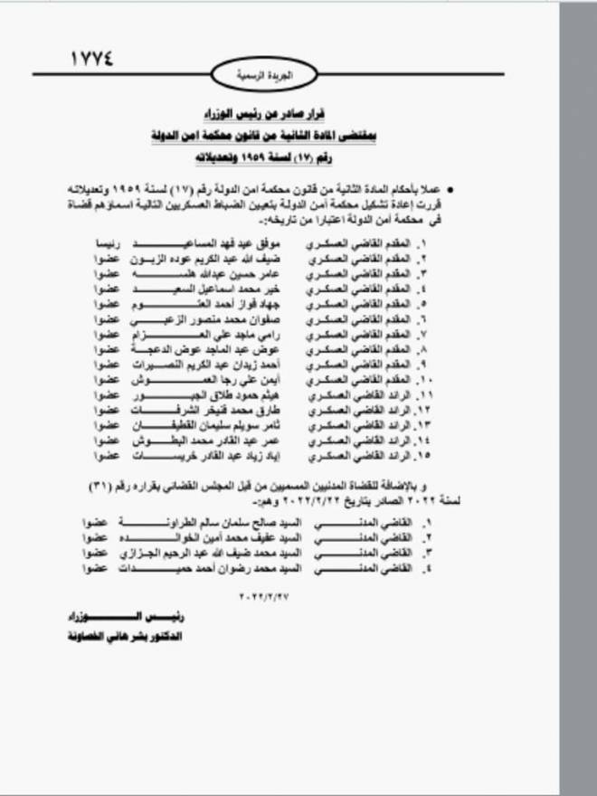- أعاد رئيس الوزراء الدكتور بشر الخصاونة، الثلاثاء، تشكيل محكمة أمن الدولة، ليترأسها المقدم القاضي العسكري موفق عيد المساعيد.