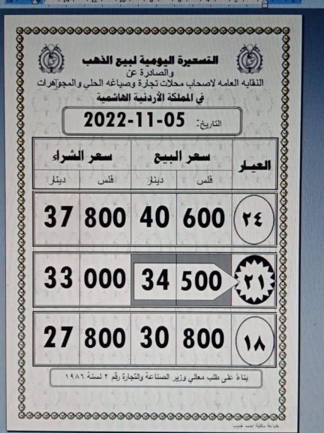 ووفقا للتسعيرة اليومية الصادرة عن النقابة، ارتفع سعر بيع الغرام الواحد من عيار 21 قيراط، الأكثر طلبا بين الأردنيين، إلى 34.5 دينار، 33 دينارا للشراء.