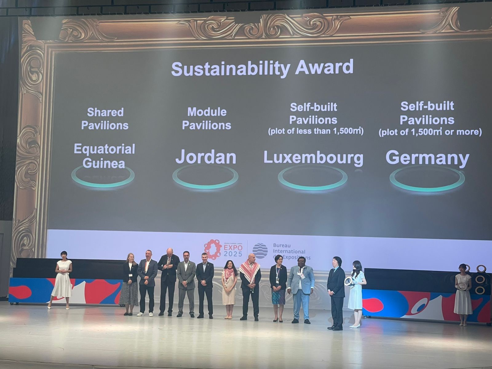 حصدت المملكة الأردنية الهاشمية جائزتين ذهبيتين في حفل جوائز المشاركين الرسميين الذي ينظّمه المكتب الدولي للمعارض (BIE) ضمن فعاليات "إكسبو 2025 أوساكا"، عن فئتي تطوير مضمون الجناح والاستدامة للأجنحة متوسطة الحجم(فئة B).