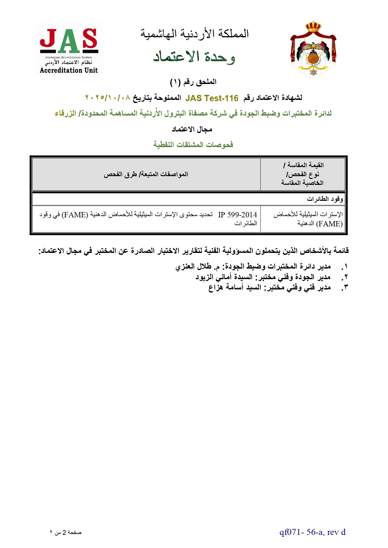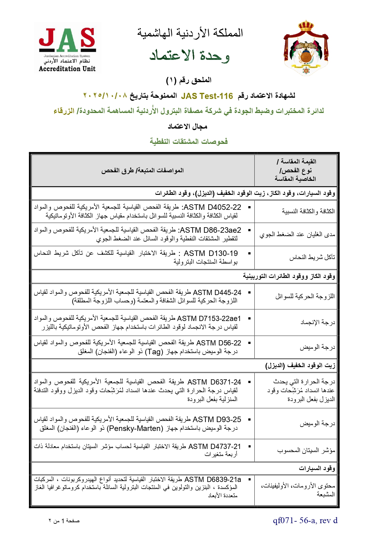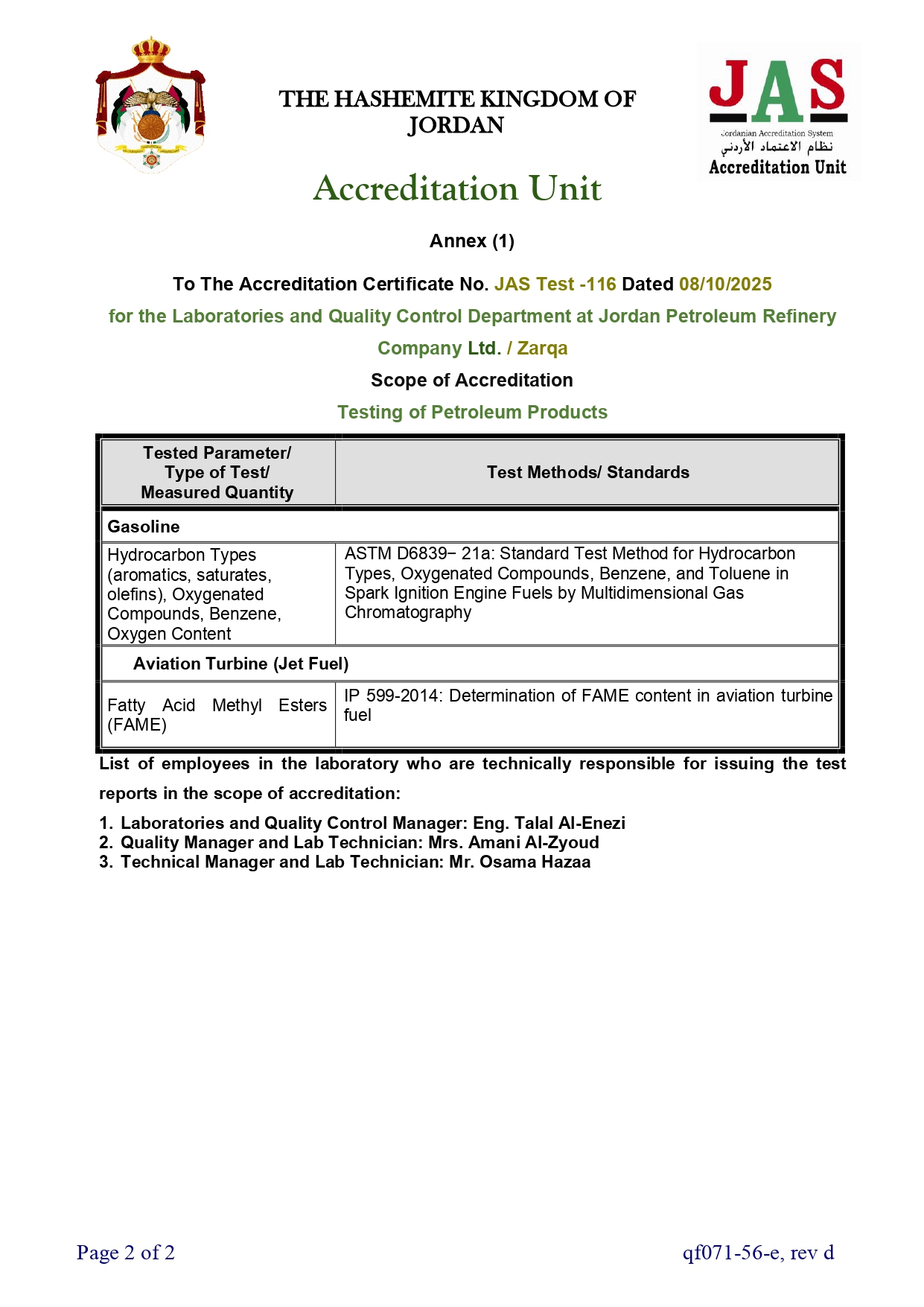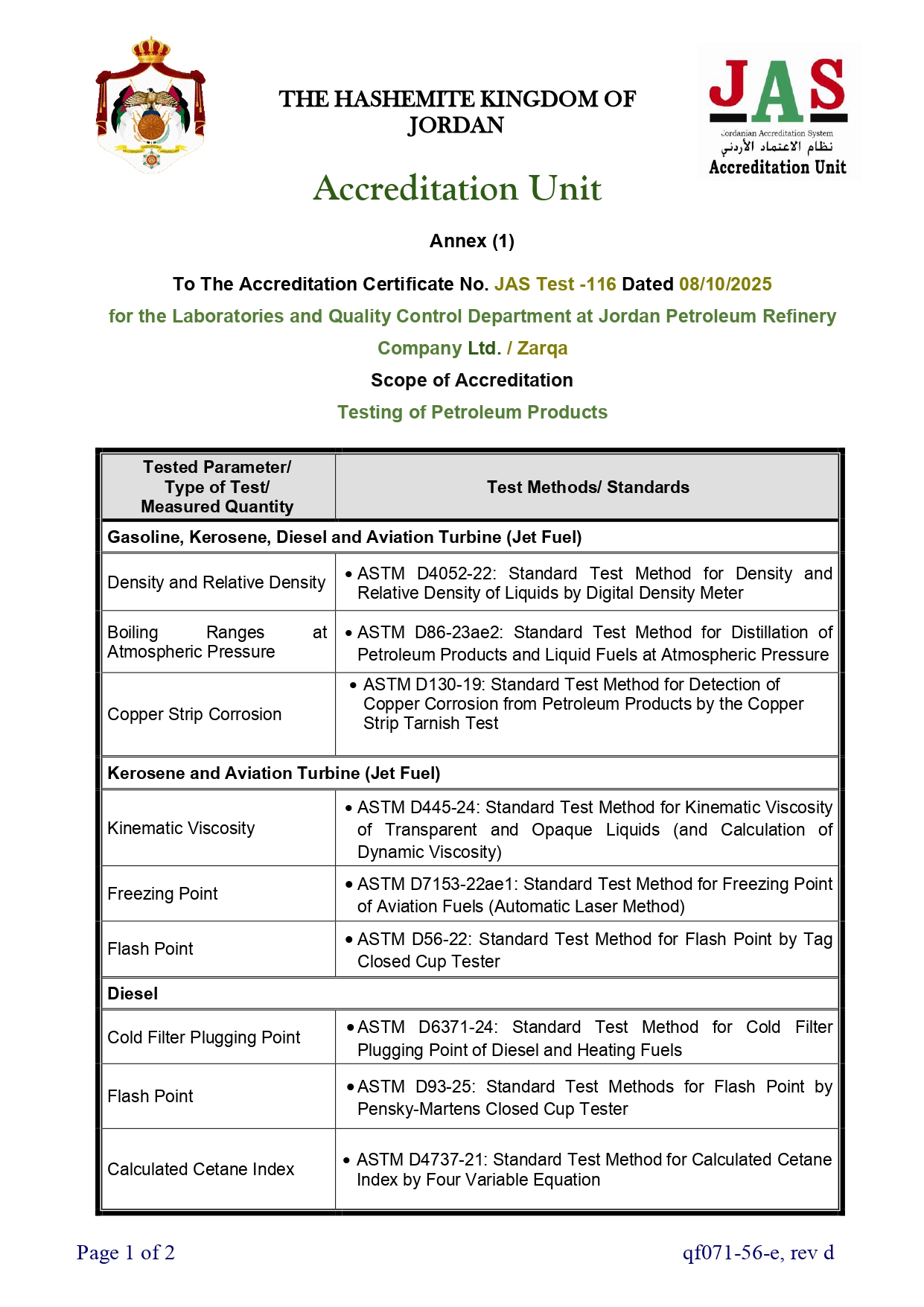 وجاء هذا الاعتماد بعد قيام وحدة الاعتماد - نظام الاعتماد والتقييس الأردني - بالتأكد من تطبيق المختبرات لمتطلبات المواصفة الدولية الايزو/ أييسي (ISO/IEC 17025:2017) في مجال فحوصات المشتقات النفطية، وبناءً عليه فإن تقارير الفحص الصادرة عن المختبر معترف بها دوليًا ومقبولة في جميع أنحاء العالم.