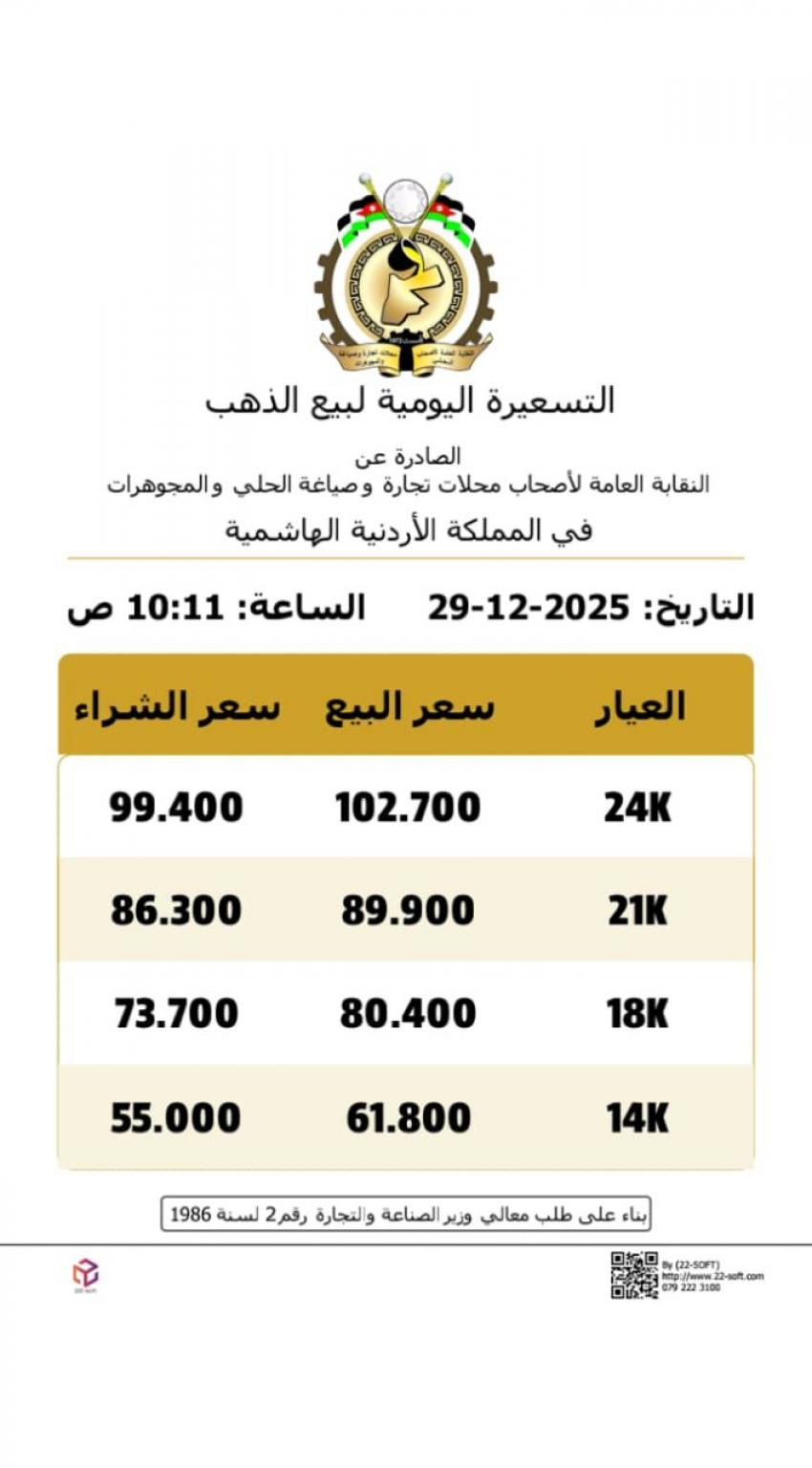 وبلغ سعر بيع غرام الذهب عيار 21، الأكثر رغبة من المواطنين في السوق المحلية، عند 89.9 دينارا لغايات البيع من محلات الصاغة، مقابل 86.30 دينارا لجهة الشراء.