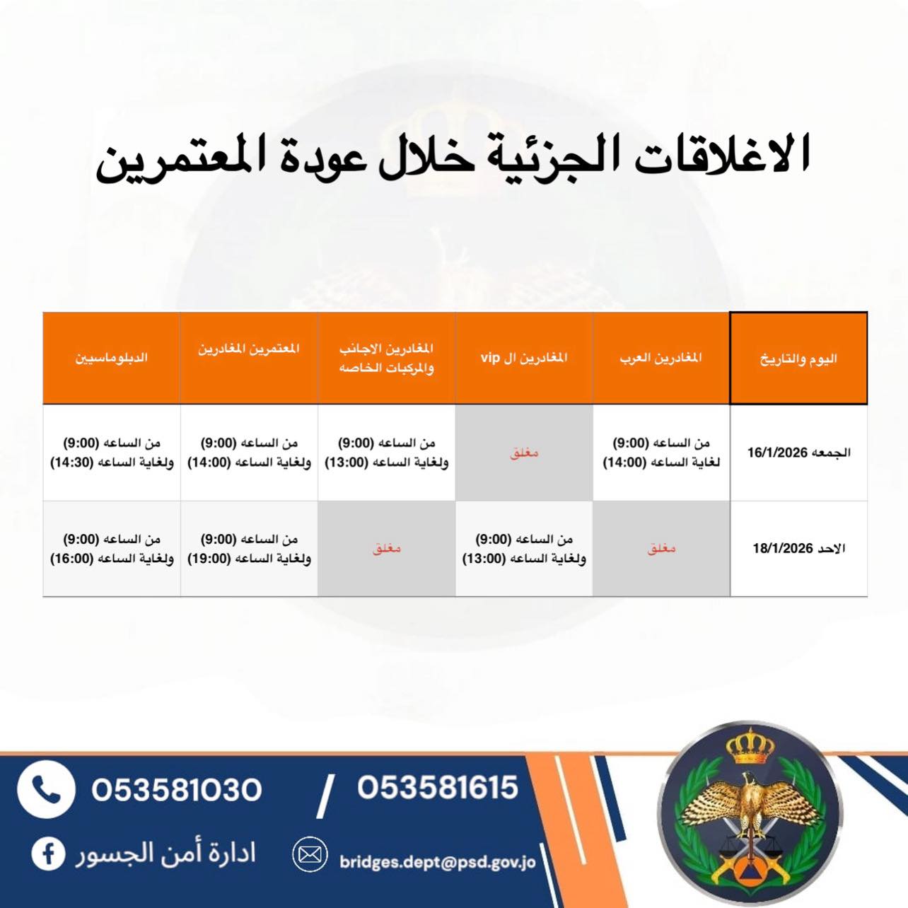وكانت أعلنت إدارة أمن الجسور في وقت سابق أنه من المتوقع أن يشهد جسر الملك حسين خلال الفترة من 14/1 ولغاية 21/1 حركة نشطة للمسافرين، بالتزامن مع عودة عدد كبير من حافلات العمرة.