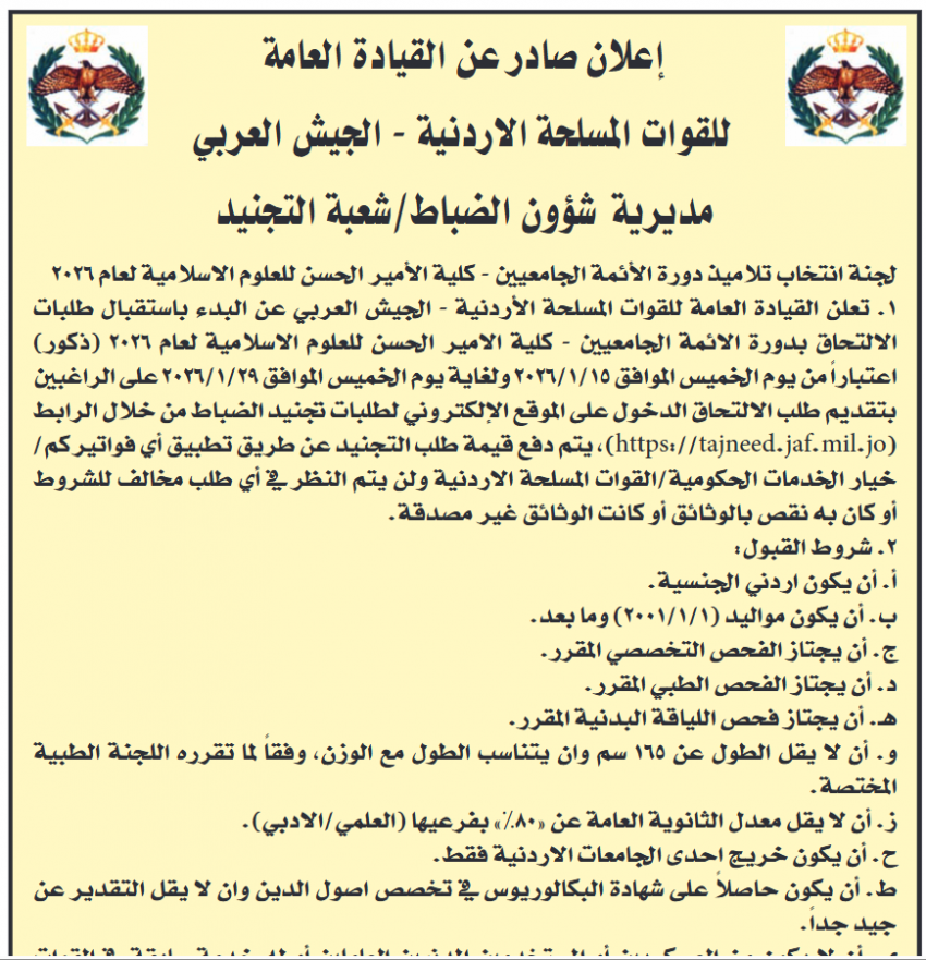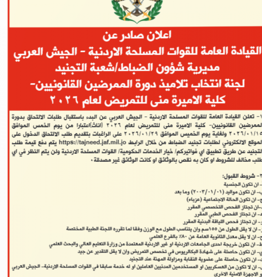 كذلك أعلنت القيادة العامة للقوات المسلحة الأردنية – الجيش العربي، اليوم الخميس، عن البدء باستقبال طلبات الالتحاق بدورة الممرضين القانونيين في كلية الاميرة منى الحسين.