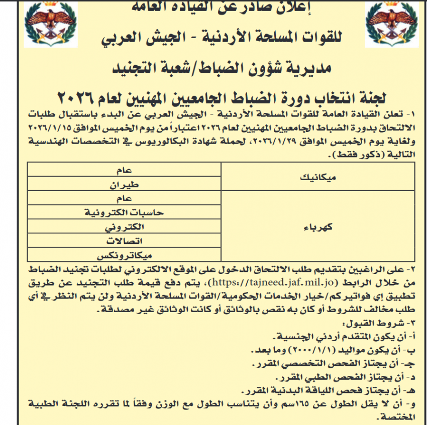 كرمالكم :   أعلنت القيادة العامة للقوات المسلحة الأردنية – الجيش العربي عن البدء باستقبال طلبات الالتحاق بدورة الضباط الجامعيين المهنيين لعام 2026 من حملة شهادة البكالوريوس في التخصصات الهندسية التالية (ذكور فقط).