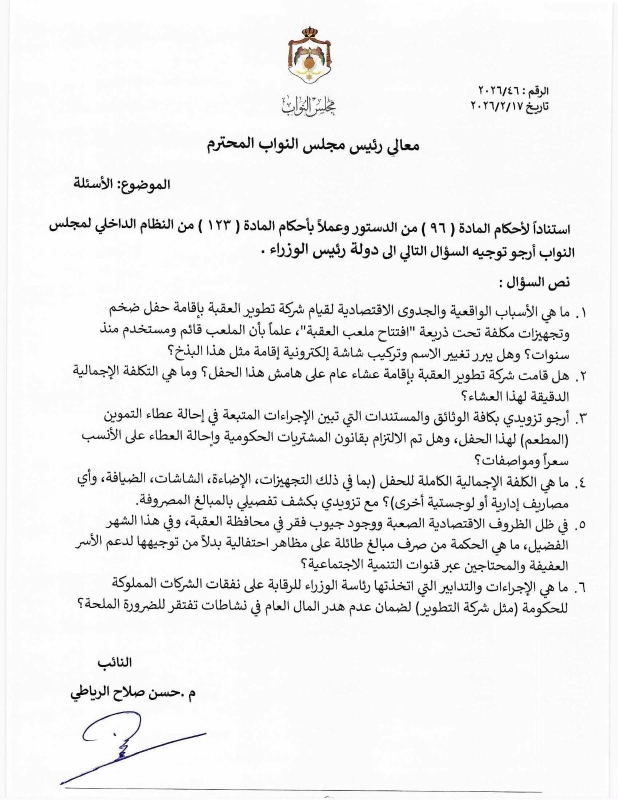 وجّه النائب حسن صلاح الرياطي سؤالاً نيابياً إلى دولة رئيس الوزراء، استناداً لأحكام المادة (96) من الدستور والمادة (123) من النظام الداخلي لمجلس النواب، مطالباً بتوضيحات حول نفقات شركة تطوير العقبة.