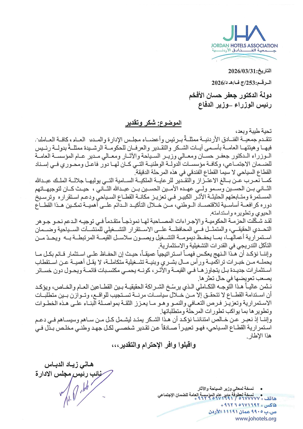أصدرت جمعية الفنادق الأردنية كتاب شكر وتقدير وعرفان إلى الحكومة الأردنية، تقديراً للجهود المتميزة التي بذلتها في دعم القطاع السياحي، لا سيما القطاع الفندقي، من خلال الحزمة الحكومية الأخيرة التي ركزت على تعزيز الاستقرار التشغيلي وضمان استمرارية المنشآت السياحية في مواجهة التحديات الراهنة.