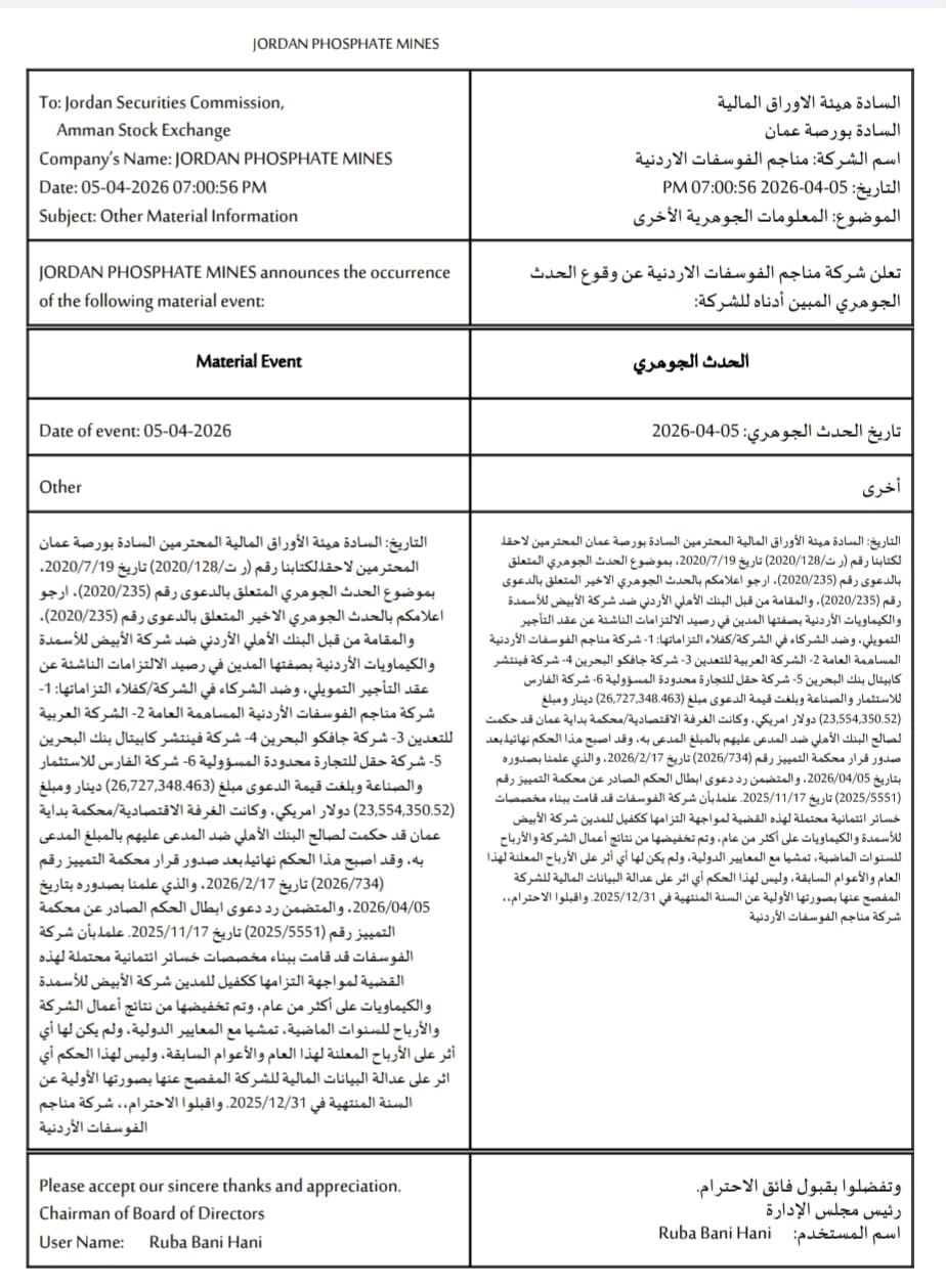 وبينت الشركة في إفصاح عبر هيئة الأوراق المالية وبورصة عمان، أن هذه القضية لم يكن لها أي أثر على الأرباح المعلنة لهذا العام والأعوام السابقة، وأن هذا الحكم ليس  له أي أثر على عدالة البيانات المالية للشركة المفصح عنها بصورتها الأولية عن السنة المنتهية في 31-12-2025.